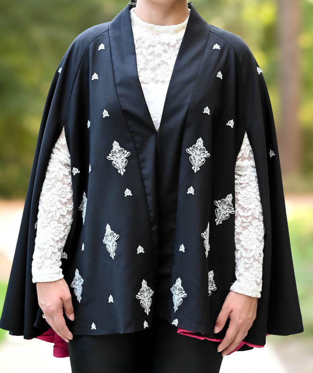 This cape was imagined as a refined cover-up that feels instantly dressy but remains light, fluid, and adaptable. Its silhouette fuses tailored strength with feminine movement—sharp lines in the front, soft elegance in the back. Embellished with intricate, Eastern-inspired medallion motifs, and lined with a vibrant flash of fuchsia, it’s designed to be a forever piece. Whether layered over a gown or jeans, it’s meant to evoke confidence, comfort, and a touch of the unexpected.